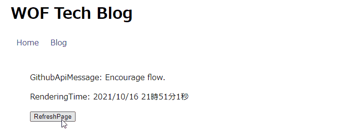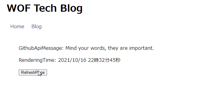 pages/ssg.jsimport fetch from 'node-fetch'function Blog(props) {const post = props.messageconst date = props.date_stringconst refreshPage = () => {window.location.reload();}return (<><ul>GithubApiMessage: {post}</ul><ul>RenderingTime: {date}</ul><ul><button onClick={refreshPage} >RefreshPage</button></ul></>);}export async function getStaticProps() {const requestUrl = "https://api.github.com/zen"const response = await fetch(requestUrl)const message = await response.text()const date = new Date();const date_string = date.getFullYear() + "/" +(date.getMonth() + 1) + "/" +date.getDate() + " " +date.getHours() + "時" +date.getMinutes() + "分" +date.getSeconds() + "秒"console.log(date_string)return {props: {message,date_string},};}export default Blog;